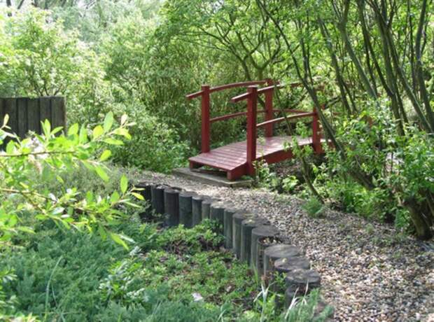 Можно менять направление дорожки и сделать вид, что она ведет еще куда-то. Здесь на фото вдоль дорожки установлен мостик, он меняет направление, хотя ведет в тупик, но правильно посаженые растения завуалируют тупик и расширят сад.