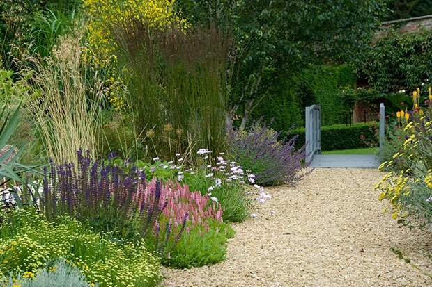 Гравийные дорожки не менее интересны, но чтобы они были более практичными, нужно сделать им обрамление. Обрамление бордюрчиком или растениями. А сочетая крупные и мелкие растения, можно задать направление движения по саду.